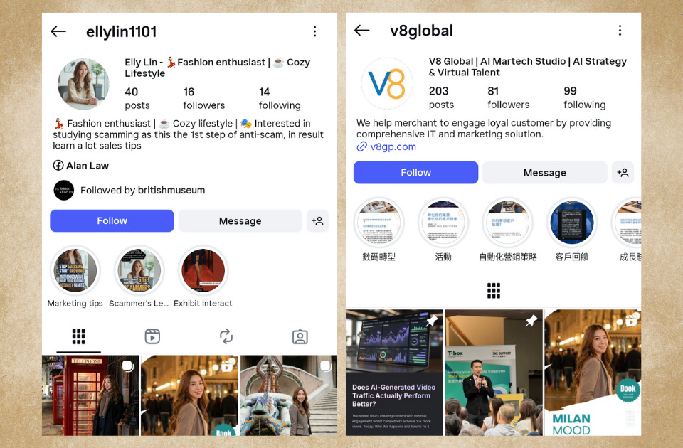 Elly Lin appears to be a fully AI-generated persona associated with V8 Global, an “AI strategy agency.” She is still followed by the British Museum. Her bio states she is “a Fashion enthusiast Cozy lifestyle, and Interested in studying scamming as this the 1st step of anti-scam, in result learn a lot sales tips.” This is odd and raises serious red flags. The extremely low follower account is also highly suspicious.